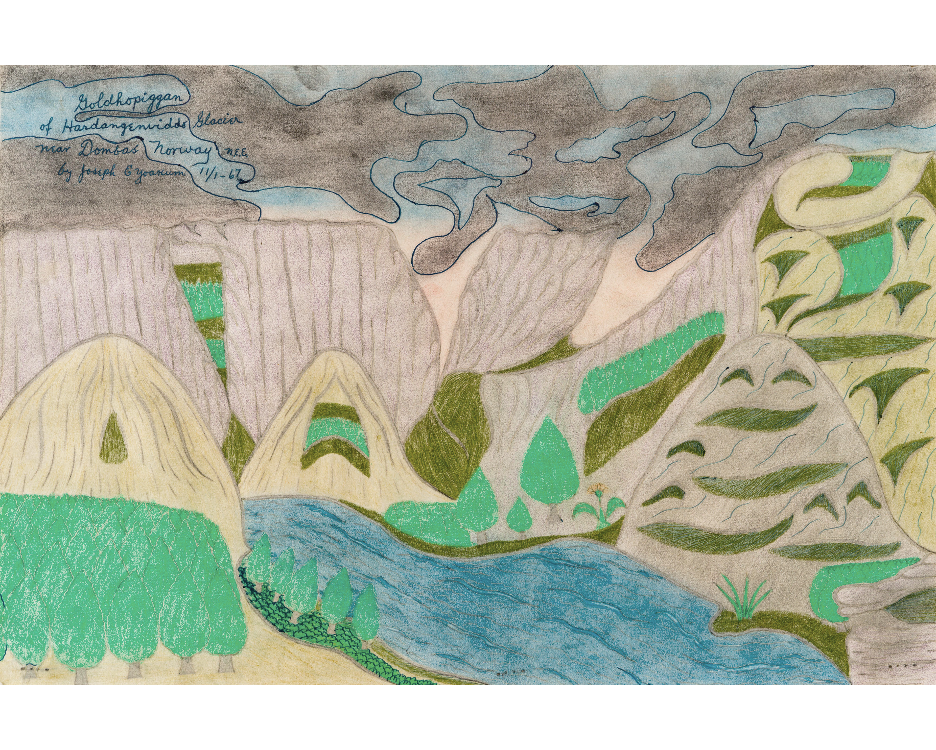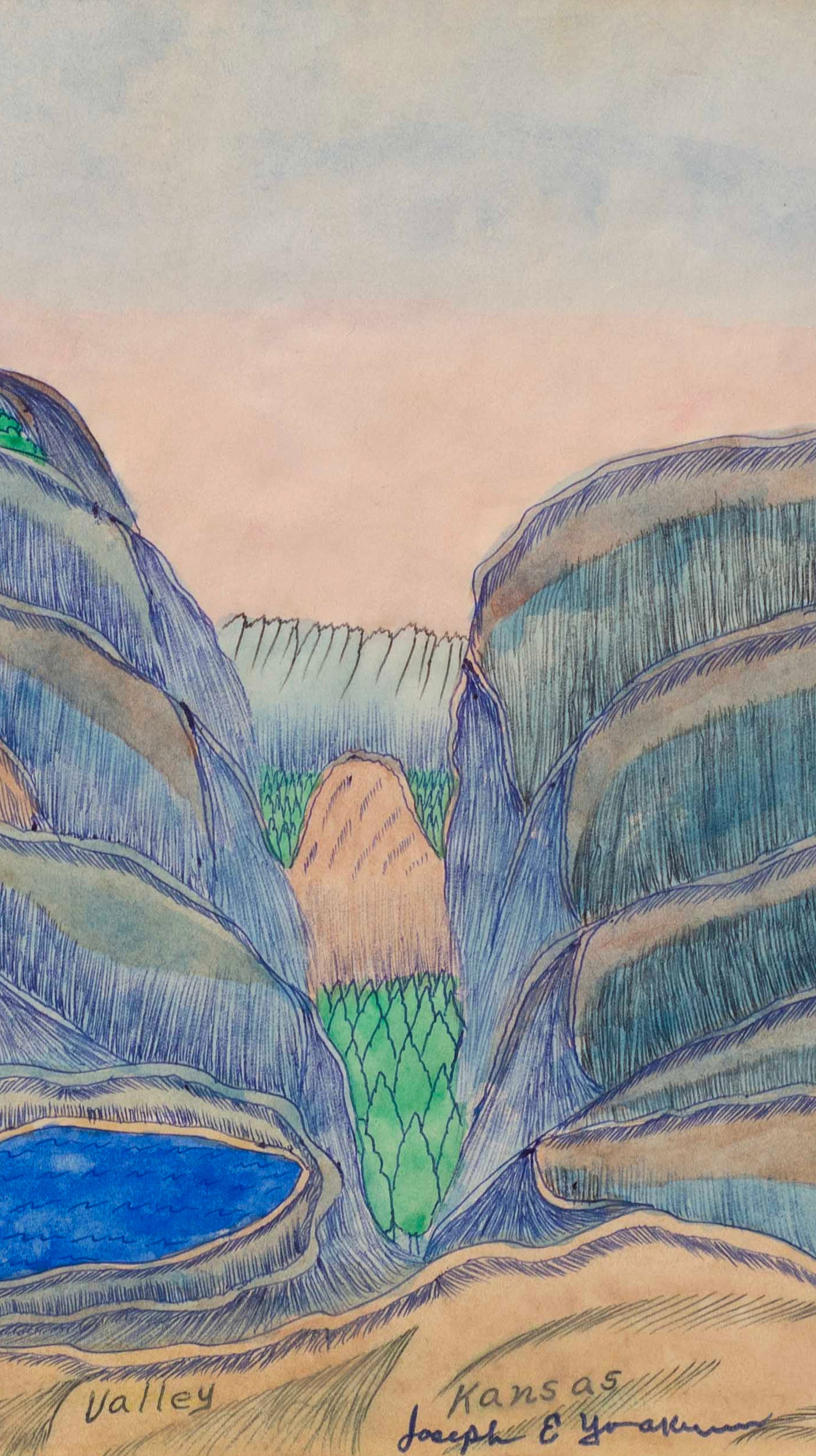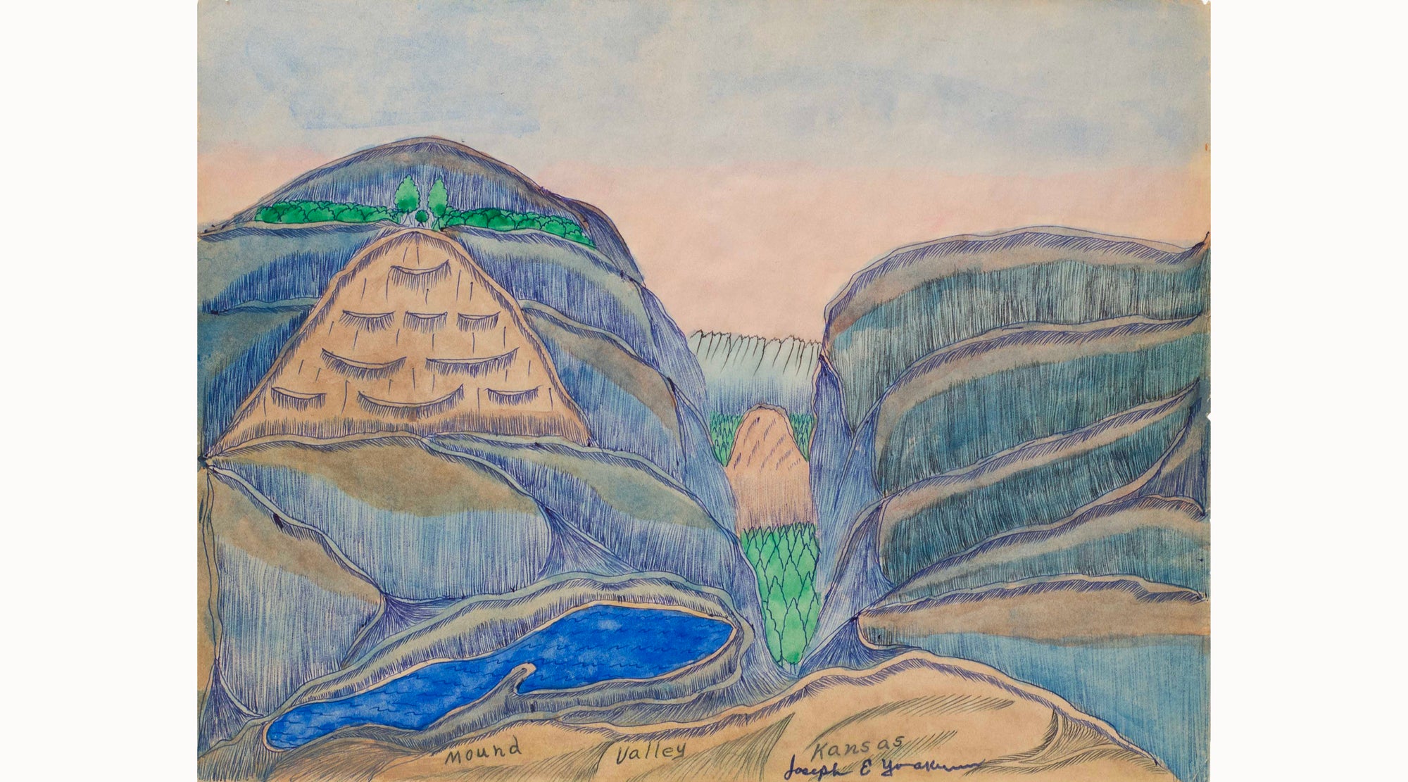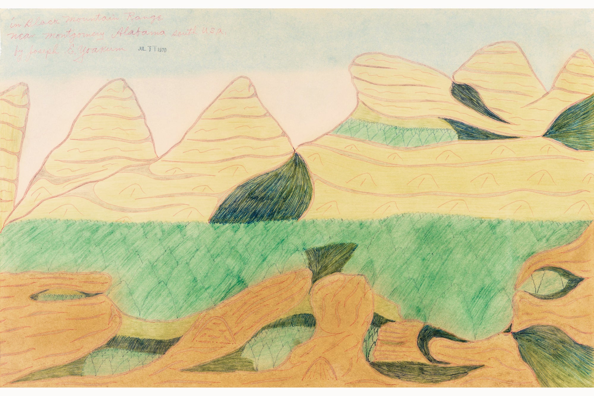 La vision singulière de Joseph E. Yoakum (1891–1972) sur les paysages est nourrie par ses voyages à travers le monde et son expérience de la Première Guerre mondiale. Artiste autodidacte, il construit un monde romantique inspiré de cartes postales, dessinant plus de deux mille paysages immersifs, de pleine page, de mémoire — retraçant ainsi une vie nomade à travers les territoires des États-Unis et d’ailleurs.