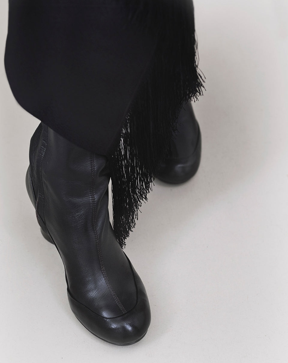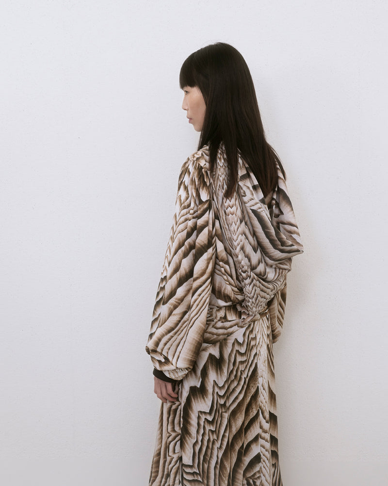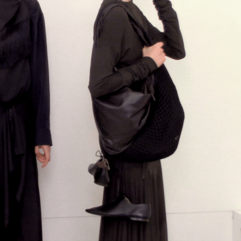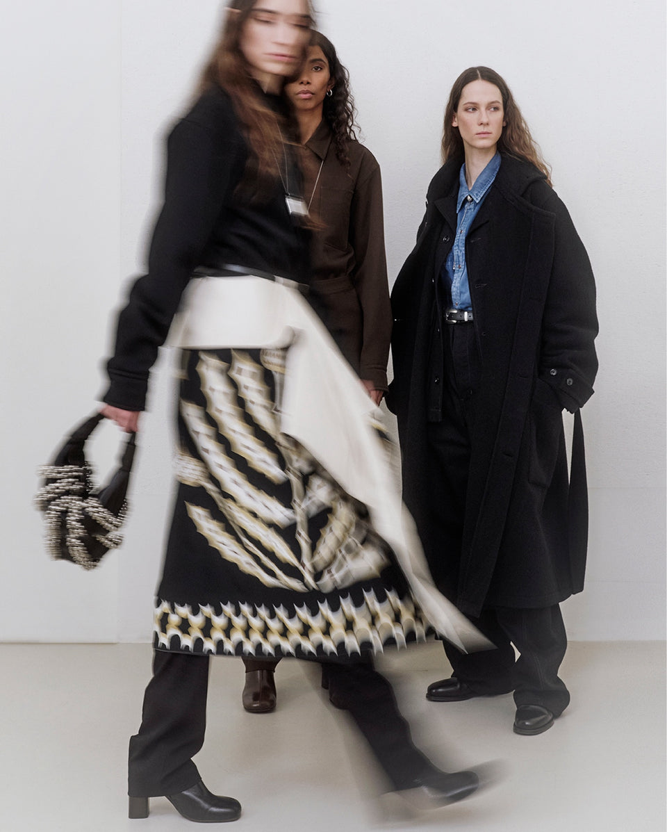 The tailoring is more relaxed, with cashmere flannels and mossy wools. Technical details enrich the archetypes of the LEMAIRE wardrobe: coated cotton, waterproof blocktech, satin nylon, and down jackets offer protection from the elements. The interplay between layers is accentuated by new hybrids of domestic comfort: in-and-out pyjamas, a shirt-jacket, loose yak and alpaca knits, and a bathrobe-coat, all bearing LEMAIRE’s signature aesthetic.