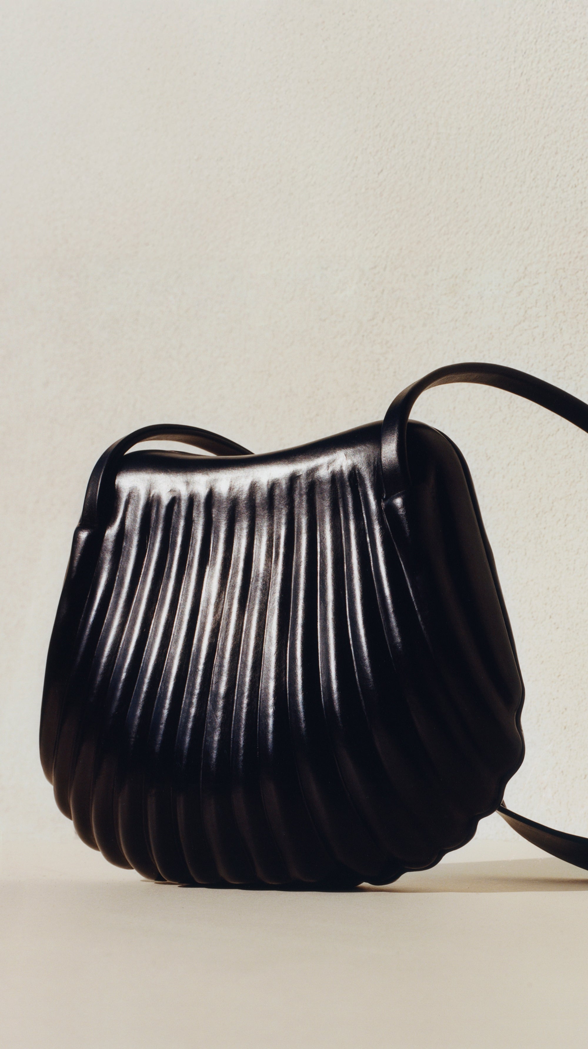 There’s something friendly about the shape, which one could easily imagine serving as a conversation starter between two strangers in the street or elsewhere. The Carlos bag is a magic beacon, an object of erotic projection that stimulates the touch and the imagination. Its unctuous, glossy shape resembles a gigantic, generously proportioned clamshell. The bag is the result of a collaboration between the artist Carlos Peñafiel and LEMAIRE.