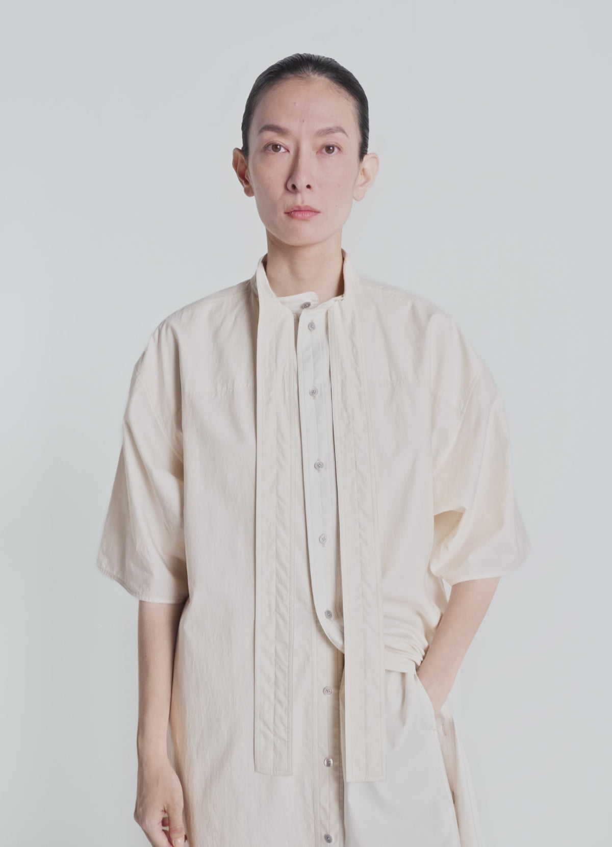 This long tube dress with a reworked volume modernizes the shirtdress with a tie-neck scarf. The cotton-and-washed-silk piece has a subtle sheen and a uniquely delicate touch.